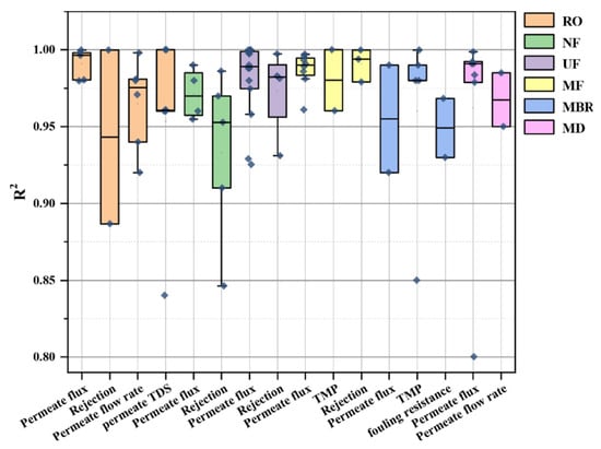 Accuracy of ANNs in predicting membrane fouling in different membrane-based processes. R2 values from 60 studies (from 2002 to 2021) were used. Reproduced with permission from [17] (Artificial intelligence-incorporated membrane fouling prediction for membrane-based processes in the past 20 years: A critical review), published by Elsevier (2022).