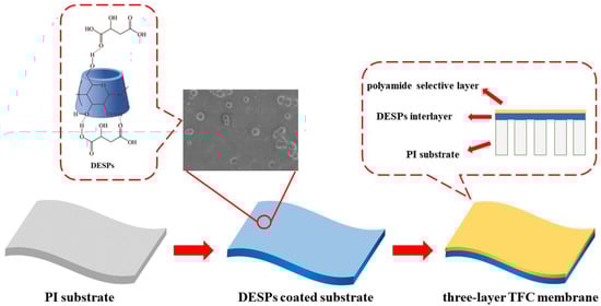 A certain mass of cyclodextrin and malic acid (molar ratio 1:5 or 1:10) were mixed with deionized water. Then, the mixture was stirred at 80 °C for 3 h. After that, the mixture was heated to 120 °C to evaporate the water. Then, transparent DESPs could be obtained. With the application of spin coating method, cyclodextrin supramolecular polymers with different mole ratios were dropped onto the surface of the PI substrate at a low rotational speed, and the uniform coating of DESPs was derived at a high rotational speed. The membranes with DESPs coating were dried at room temperature. To obtain the polyamide active layer, the PI substrate coated with DESPs interlayer was first immersed in 0.2 wt% MPD/water solution for 3 min. Then, 0.15 wt% TMC/hexane solution was poured onto the top surface of the membrane for 1 min. The modified TFC membrane was washed with isopropanol and then kept in an oven at 60 °C for 8 min. Finally, the obtained membranes were stored in ethanol at least 24 h before use. These modified TFC membranes were denoted as TFC/DESPsn-PI, where n refers to the molar ratio of malic acid to cyclodextrin. The TFC/PI membrane was obtained by interfacial polymerization reacting directly on the PI layer.