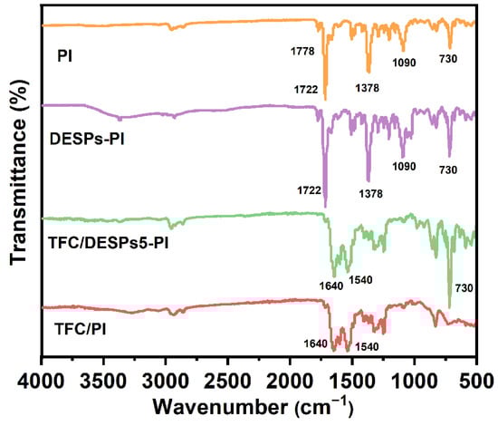 ATR-FTIR spectra of PI, TFC/PI, DESPs-PI, and TFC/DESPs-PI.