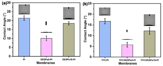 Ethanol contact angles of (a) PI, DESPs5-PI, DESPs10-PI substrates and (b) TFC/PI, TFC/DESPs5-PI, TFC/DESPs10-PI membranes.