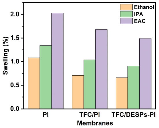 The swelling degree of the PI, TFC/PI and TFC/DESPs5-PI membrane in three different solvents (ethanol, isopropanol and ethyl acetate) were tested. The results are displayed in Figure 5. Since the polarity order of the three solvents is ethanol > isopropanol (IPA) > ethyl acetate (EA), the swelling degree of PI substrate and TFC membranes in ethyl acetate were larger than in ethanol, and the low polarity solvent molecule is more likely to cause the movement of the polymer chain segment. Additionally, the swelling degree of the TFC/PI composite membrane in three different organic solvents was lower than that of the PI substrate. The reason might be that the dense polyamide layer, formed with interfacial polymerization, increases the crosslinking of the composite membrane, weakening the influence of solvents on the polymer chain segment, thus the solvent resistance of the TFC/PI membrane is enhanced. Apparently, after DESPs were introduced into the composite membrane, the swelling degree decreases further. The reason might be that the hydrogen bond network of DESPs creates a higher viscosity, and the structure of the hydrogen bond network is stable in organic solvents []. The DESPS interlayer combined with the substrate and polyamide active layer closely and enhanced the stability of the triple-layer composite membrane in organic solvents.