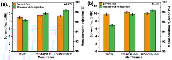 Solvent flux (Jw) and monascorubrin rejection (RM) of the TFC/PI, TFC/DESPs5-PI, and TFC/DESPs10-PI membranes. ((a). AL-FS mode, (b). AL-DS mode, 1.0 M LiCl/ethanol solution as draw solution).