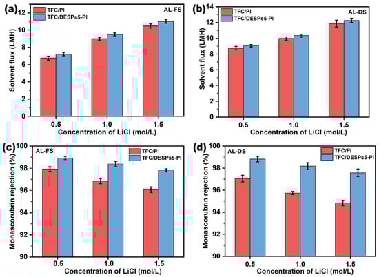 The driving force of FO is the osmotic pressure difference between the draw solution and the feed solution. Hence, the concentration of draw solution will influence the performance of FO membrane. As shown in Figure 7a,b, the solvent flux improved gradually with the increase of draw solution concentration, but the increasing trend decreased, attributed to the occurrence of internal concentration polarization (ICP) in the porous support layer of the composite membrane []. For instance, the osmotic pressure of 0.5 M LiCl/ethanol solution (draw solution) is about 16.73 bar. In Al-FS mode, the flux of TFC/DESPs5-PI is about 7.22 LMH. However, the flux is 11.02 LMH in the same operation mode with 1.5 M LiCl/ethanol draw solution, whose osmotic pressure is about 41.14 bar. The permeation flux did not show a linear increase trend with the increase of the concentration of the draw solution. On the one hand, the increase in the concentration of the draw solution generated a greater driving force. On the other hand, a higher concentration of draw solution leaded to more serious ICP of the composite membrane and reduced the effective osmotic pressure difference, thus affecting the growth of permeation flux and resulting in a lower flux than the theoretical value.