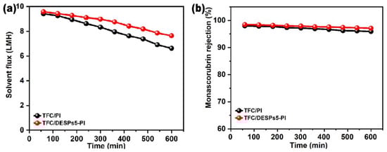 To evaluate the stability of solvent-resistant composite membranes, solvent flux and monascorubrin rejection rate were tested for 600 min with the TFC/DESPs5-PI membrane in contrast to the TFC/PI membrane. It was shown that, in Figure 8, the flux and rejection rate of the two membranes decreased with time. On the one hand, ethanol in the feed solution diffused to the draw solution side, which decreased the concentration of draw solution and resulted in a decreased driving force of FO. On the other hand, with time prolonging, the diffusion of solution in two sides of the membrane might lead to part of membrane pores’ blocking and fouling. In addition, the composite membranes in an organic solvent for a long time would swell and destroy the membrane structure to a certain degree, reducing the separation performance of the composite membrane. However, comparing the performance of the TFC/DESPs5-PI membrane with the TFC/PI membrane, the attenuation of the TFC/DESPs5-PI membrane was smaller than that of the TFC/PI membrane, indicating that the stability of the membrane with DESPs interlayer was improved.