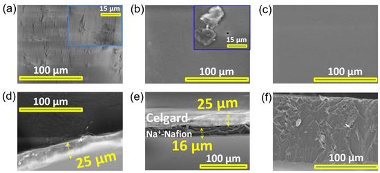 Figure 2. SEM micrographs of the plane view of (a) Celgard, (b) composite, and (c) Na+-Nafion 115. (df) The corresponding cross-section view of these samples in (ac). Inset images for (a,b) represent a magnified view of the SEM image, with a scale bar of 15 µm.