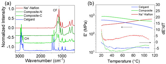 Figure 3. (a) IR spectra of Celgard, Na+-Nafion, and the two surfaces of the Na+-Nafion composite membrane. The Composite_C designation refers to the Celgard side of the membrane, while Composite_N designates the Na+-Nafion side of the membrane. (b) Thermo-mechanical properties of various membranes.
