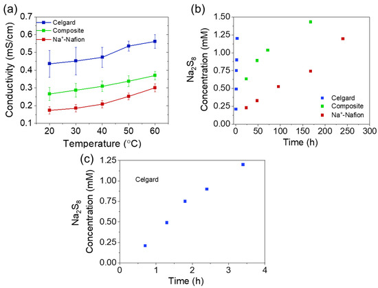 The Na+ conductivity of the membranes was measured by electrochemical impedance spectroscopy utilizing a sodium metal symmetric cell (Figure 4a). As expected, the Celgard separator exhibits the highest conductivity (0.44 mS/cm at room temperature) due to its porous structure, which allows for fast ion transport. The composite membrane shows slightly higher conductivity than Na+-Nafion (0.26 and 0.17 mS/cm, respectively). The conductivity of the composite membrane is similar to the expected value calculated from simple mixing, which considers the Nafion and Celgard layers resistances (and thicknesses) to be additive (0.22 mS/cm2). Importantly, the ASR of the composite and Na+-Nafion membranes (24 and 20 Ω cm2, respectively, Table 1) utilized in this work are significantly lower than the Nafion 115 membrane (88 Ω cm2) we previously reported in a Na|Nafion|Na2Sx hybrid RFB [7]. Notably, lower ASR is typically offset by the higher crossover rates of the catholyte redox active species.