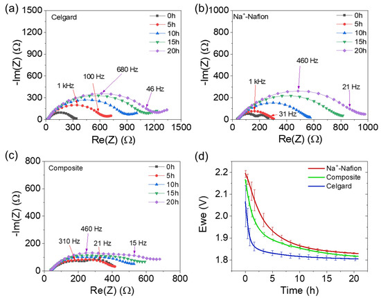 The evaluation of the electrochemical stability of each membrane was performed in a Na|membrane|Na2Sx coin cell configuration using time-resolved electrochemical impedance spectroscopy and open-circuit voltage measurements, as shown in Figure 5. The full cells were prepared with a sodium metal anode, membrane, and a 0.25 M Na2S8 in 0.5 M NaPF6/diglyme-soaked carbon paper. The Nyquist plots exhibit a high frequency resistance associated with the bulk membrane resistance. The low frequency response exhibits distorted, convoluted semi-circle(s), and may be due to any of the following processes: (i) passive films on the Na anode; (ii) charge transfer associated with the Na2S8 catholyte [15]; and/or (iii) the diffusion of redox active species with nonblocking boundary conditions. In this work, we do not attempt to precisely identify or decouple low-frequency features, and instead qualitatively assign them as interfacial resistance. In all cases, the interfacial resistance increases with time, indicating drift in the system (e.g., due to reactions at one or both electrodes). Plausible mechanisms whereby such drift may occur include: (i) the reductive decomposition of Na2S8 to Na2S on the Na metal surface due to catholyte crossover through the membrane; and (ii) the reductive decomposition of Na+-Nafion in contact with Na metal. In both cases, the unstable passivation of the Na anode is expected to increase the interfacial resistance with time. The initial interfacial resistance of the membranes is similar, with Nafion being the lowest (308 ± 35 Ω), followed by Celgard (360 ± 60 Ω) and the composite membrane (430 ± 33 Ω). However, the interfacial resistance increased quickly for both Celgard (1330 ± 210 Ω) and Nafion (1075 ± 105 Ω) samples over 20 h. In contrast, the composite membrane experiences the least increase in interfacial resistance among the three samples (750 ± 115 Ω). Similarly, the open-circuit voltage, Ewe, decays over time for all three membranes, mainly due to a self-discharge process in which Na2S8 crosses through the membrane and is reduced at the anode to form insoluble products. Na2S, which is insoluble in diglyme, is the expected thermodynamic endpoint for such reactions. The Ewe value is the highest for the Na+-Nafion membrane after 2 h of relaxation, consistent with the permeability values mentioned above (Table 1). The initial Ewe of Celgard is lower than that of Na+-Nafion and the composite membrane, further supporting the fast crossover of Na2S8 through the porous separator.