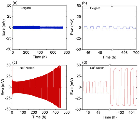 The membranes’ electrochemical stability was further evaluated by sodium stripping and plating in a sodium symmetric cell at ±100 µA/cm2 (Figure 6). Celgard shows a stable cycling profile over the testing period of 750 h, suggesting that the diglyme-based electrolyte aids in stabilizing the sodium metal, as seen with previous works. A symmetric cell utilizing a Celgard separator and a NaBF4/diglyme electrolyte cycled at 100 μA/cm2 was reported to last for over 3000 h [16]. Comparably, symmetric cells utilizing carbonate-based electrolytes short circuit in <150 h [17,18,19], although it should be noted that the failure of symmetric cells is subject to testing protocol details (e.g., current density, areal capacity, cumulative capacity passed, etc.), which makes direct comparisons across studies difficult. Compared to Celgard, the cell containing a Na+-Nafion membrane shows a steady increase in the overpotential with time before shorting at 445 h. The increase in overpotential indicates that Nafion is not electrochemically stable against sodium metal and that a resistive solid-electrolyte interface layer is formed [20], which is consistent with the AC impedance measurements shown in Figure 5. Even so, the Na+-Nafion membrane outperformed linear and crosslinked poly(ethylene oxide) [21,22] and polyvinylidene-fluoride-co-hexafluoropropylene-based (PVDF-HFP) membranes in prior studies [23,24]. The composite membrane demonstrates stable performance with only a slight increase in overpotential during 2300 h of testing. This finding indicates that the composite membrane reported here provides two key advantages over traditional materials by: (i) mitigating the electrochemical reduction of Nafion in contact with Na; and (ii) increasing mechanical strength, which is critical for the targeted end-use application in NARFBs.