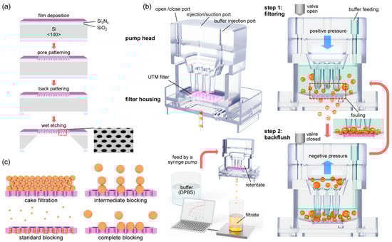 Figure 1b. The filtering system consists of a UTM filter, a pump head, a filter housing, and a syringe pump (Fusion 100, Chemyx, Stafford, TX, USA). To control the step motor in the syringe pump, a Linux-based 8-bit MCU embedded system (ATmega 328) was used. A GUI program was developed by Python for driving the embedded system. The reciprocating piston motion of the syringe pump was applied to continuously disperse the cells to prevent fouling of the filter. The detailed method of back flushing in the filtering process is as follows. In the upper part of PHF, 3 ports are formed on the top of it, an open/close port on the left, an injection/suction port in the middle, and a buffer injection port on the right. PHF operates in two steps. In step 1, positive pressure is applied to the middle port to proceed with filtering. At this time, the left port is opened by the solenoid valve. DPBS buffer solution is continuously supplied to the right port at a flow rate of 1 to 4 mL/min depending on the filtration rate. In step 2, negative pressure is applied to the middle port to prevent fouling of the membrane filter. At this time, the left port should be closed to ensure a complete seal. To optimize filtering, steps 1 and 2 of the protocol operated for 5 s each, and were then repeated. The PHF system is similar to the existing systems, but is much more compact and efficient [