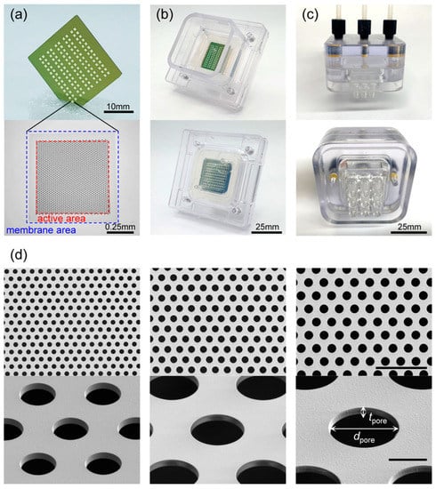 tpore). The distance between pores was chosen to render the porosity about 32.5%. Each membrane has an area of 0.825 × 0.825 mm, and a pore array was patterned in an active area of 0.7 × 0.7 mm. Therefore, as 130 membranes were used, the total active area was 63.7 mm