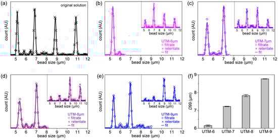 Figure 3b–e shows the size distributions of beads in the filtrates and retentates when the suspension was filtered through UTM-6, 7, 8, and 9, respectively. Usually, the