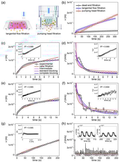 Figure 5e shows that, during TFF, not only the filtering volume increased but the fouling initiation time was delayed, implying that the filter blocks more slowly even at much higher filtration volumes than that of DEF. Unlike during DEF, flux continues, thus never becoming completely saturated, even after fouling onset [