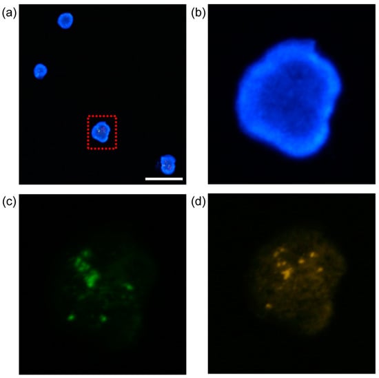 Figure 6d shows the protein-tyrosine protein kinase abl1 gene stained orange. K562 cells are chronic myeloid leukemia (CML) cells. The BCR-ABL gene sequence is created via partial breakage and joining of chromosomes 9 and 22. Thus, BCR-ABL status can be observed using a single filtered cell [