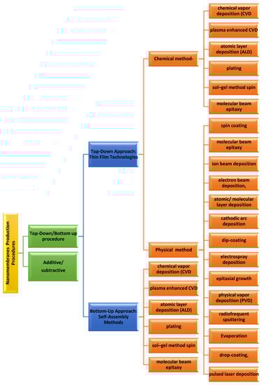 Nanomembrane production procedures encompass two distinct approaches. The first one is the additive/subtractive procedure of manufacturing the nanomembranes and another is the top–down/bottom–up tactic. The additive/subtractive fabrication is the procedure related with the membrane material. As the name indicates, in additive, new material has been incorporated to the membrane, whereas in subtractive, the material is detached from the membrane. The top–down/bottom–up approach explains in what way the addition and subtraction are achieved. Top–down or bottom–up approaches can be of either type, the additive or the subtractive. Details classification is provided in Figure 1 [44].