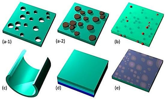 Nanomembrane functionalization. (a) Nanopatterning; (b) nanofillers; (c) rolled nanomembrane; (d) lamination; (e) surface activation [Image reprinted with reference using open access work] [45].