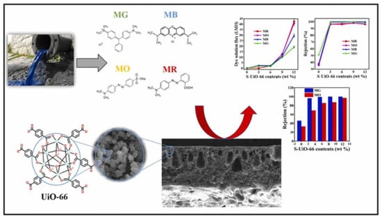 UiO-66 particles were exploited as lipophobic fillers to enhance the lipophobicity of the PSf membrane. These particles possess exceptional water stability, high thermal stability, chemical stability against organic solvents, and affinity toward organic dyes. The aperture size of UiO-66 MOF is about 6 Å, which is between the kinetic diameter of water molecules (≈2.6 Å) and most organic contaminants, making it a promising candidate for fabricating mixed matrix membranes (MMMs) for water purification. UiO-66 particles were synthesized using a solvothermal method and activated using two methods: Soxhlet extraction and centrifugation. The adsorption performance of UiO-66 MOF for the selected organic dyes was investigated, and the optimized UiO-66 MOF was incorporated into the PSf matrix to prepare the MMMs using the phase inversion technique (Figure 8). The prepared MMMs’ water remediation performance was evaluated using pure water flux and organic dye rejection, and their antifouling ability was assessed using Bovine Serum Albumin (BSA) solution as a sample. The results showed that the prepared MMMs exhibited improved lipophobicity, leading to reduced fouling and better permeation characteristics. Additionally, the MMMs’ organic dye rejection efficiency was significantly higher than that of the pure PSf membrane. The prepared MMMs also exhibited excellent antifouling characteristics when tested against BSA solution. A conclusion has been made in this study that incorporating UiO-66 particles into the PSf matrix to fabricate MMMs improved the lipophobicity, water remediation performance, and antifouling ability of the membranes. The study’s findings suggest that MMMs incorporating UiO-66 MOF could be a promising approach for developing high-performance membranes for water purification [58].