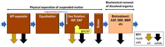 Typical oil refinery effluent treatment scheme, including a biological process step. (IGF—induced gas flotation; DAF—dissolved air flotation; ASP—activated sludge process; SBR—sequencing batch reactor; and MBR—membrane bioreactor).
