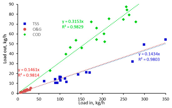 The pollutant load in kg/h to the individual process steps varied as a function of both pollutant concentration and flow rate (55–75 m3/h). Correlations of the outlet and inlet TSS, O&G and COD loads for the DAF (Figure 2) revealed a near linear relationship (R2 = 0.980–0983) for all three parameters, with a lower mean percentage removal for the COD (69%) than for the TSS and O&G (85–86% for both) due presumably to the substantial soluble fraction. The outlet concentrations for these three water quality determinants were thus proportional to the inlet load, and thus subject to a degree of data scatter as indicated by the standard deviation values (Figure 3).