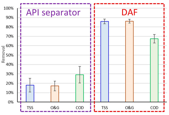 A comparison of the removals attained by the API and DAF stages (Figure 4) indicate the expected significantly greater % removal of all the pollutants by the DAF than by the API. However, contrary to the DAF trend, the API achieved higher COD than O&G and TSS removal (29% cf. 17–18%), suggesting that the COD removed at that stage was largely associated with the TSS and O&G.