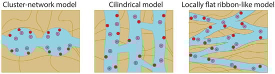 The hydrophilic region of the PFSA membranes is a system of pores connected by channels (Figure 3) [40,76]. The number of pores, their size, and degree of connectivity depend on the degree of water absorption of the membranes [77,78]. A cluster-channel model proposed by Gierke describes their structure based on the results of small-angle X-ray scattering studies of PFSA materials of different ionic forms and EW [77]. Although it is commonly recognized that hydrated Nafion is organized into distinct hydrophilic domains or clusters within the hydrophobic matrix, the geometry and length scale of these domains remain a subject of discussion. The cluster-channel model uses the average pore size, making this representation more convenient. In addition, other models have been proposed that describe the structure of PFSA membranes, the main ones being the cylindrical or layered model, the elongated polymeric aggregate model proposed by Loppinet, and the locally flat ribbon model discussed by Kreuer [40,79,80,81]. The locally flat ribbon-like model is considered to be one of the most favorable models for describing various properties of PFSA. This model considers elongated polymer aggregates with a locally flat interface (ribbon) placed in a continuous ionic medium. The morphology of Nafion demonstrates tortuosity on a scale of 30–100 nm, which is strongly influenced by pretreatment [79]. The main difference between the cluster-channel and alternative models is the shape and size of the clusters. A schematic comparison of the main models is shown in Figure 3.