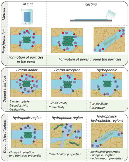 To date, there are several techniques for producing hybrid membranes. The first and highly efficient, is the in-situ formation of inorganic particles in the membrane matrix [150,151]. For this purpose, the membrane is first treated with the precursor solution and then with an additional reagent (precipitant, oxidant, or reducing agent depending on how the dopant is produced). One or more treatment cycles can be performed to obtain hybrid membranes. The advantage of this method is the production of nanoparticles whose size is limited by the pore size of the membrane, which helps to increase the hybrid effect. The precursor penetrates the hydrophilic region of the membrane, and the addition of a second reagent leads to the formation of dopant particles in a limited space, as in the nanoreactor. However, the following method has many limitations; in particular, it allows the introduction of a limited set of dopants and does not allow one to achieve a high dopant concentration (usually no more than 3–5 wt.%). In some cases, an inhomogeneous distribution of the inorganic component is observed due to the presence of many larger particles on the membrane surface and in the near-surface layers compared to those located in the bulk volume [152]. In addition, the in-situ generation method is time-consuming as for bulk modification soaking in precursor and reagent solutions can take several hours to several days and requires a large number of reagents. In addition, some types of soluble compounds, such as heteropolyacids (HPAs), can be introduced into the membrane matrix by adsorption of the solution. The stability of the resulting material will depend on the strength of the interaction between the polymer and the inorganic component. The dopants introduced in this way eventually will be leached from the membrane by contact with liquid water; nevertheless, it is possible to stabilize them by various methods.