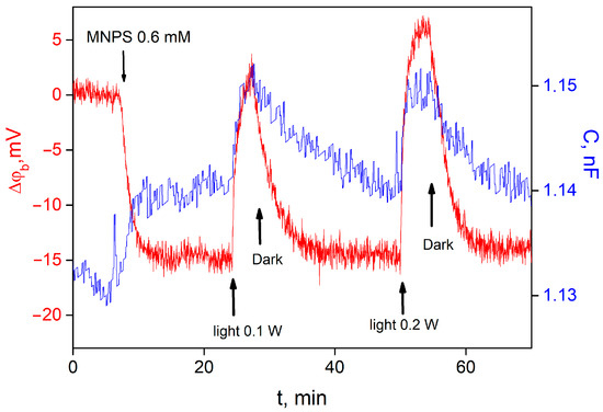 MNPS is a well-known source of protons that are released after a flash of UV light. Recently, we have demonstrated that MNPS can bond to a lipid membrane and change its boundary potential as well as electrical capacitance under illumination [13]. Addition of MNPS into the water solution at one side of the BLM led to a boundary potential difference across the membrane, the sign of which corresponded to the adsorption of MNPS anions on the membrane. Illumination of the BLM with adsorbed MNPS molecules led to a reversible change in the ∆ϕb and the membrane electrical capacitance with the magnitude depending on the light intensity (Figure 2). An increase in the intensity of the illumination raised the magnitude and the rate of ∆ϕb changes.
