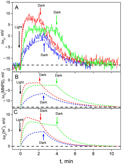 Typical experimental kinetics of the ∆ϕb change for various light intensities and their fit by the model are shown in Figure 4A. Figure 4B,C demonstrate calculated contributions to the total value of ∆ϕb from the MNPS and proton binding at the BLM, respectively. As one can see, at the beginning (t = 0), ∆ϕb was equal to the part produced by the binding of MNPS anions (compare Figure 4A and Figure 4B). After the illumination was switched on, the ∆ϕb value reflected the sum of a decrease in the number of MNPS anions (Figure 4B) and an increase in the amount of released protons (Figure 4C). The steady-state amount of MNPS anions at the BLM is considerably less than the initial one. The contribution of protons to the ∆ϕb (Figure 4C) for the high light intensity is non-monotonic and could be described by two exponential functions.