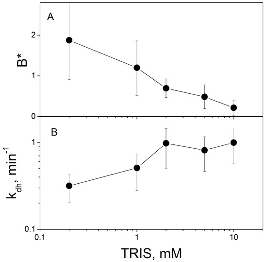 Contribution of released protons to ∆ϕb should depend on the concentration of the buffer and pH of the solution. An increase in the buffer concentration reduces the amount of non-equilibrium protons bound to the BLM and the respective part of the ∆ϕb change [7,9]. Figure 5 demonstrates that the increase in the TRIS concentration decreases the parameter B* (ratio of steady-state ∆ϕb values caused by protons and MNPS anions) determined by the fitting of the experimental data (Figure 5A) and increases the rate constant kdh (Figure 5B).