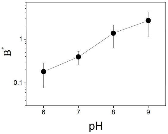 The change in ∆ϕb due to binding of protons depends on the pH of the solution (Figure 6). The parameter B* increases with the pH in the entire range of the measurements, from 6.0 to 9.0. It means that the decrease in pH attenuates the ∆ϕb change due to bound protons similarly to the effect of the buffer.