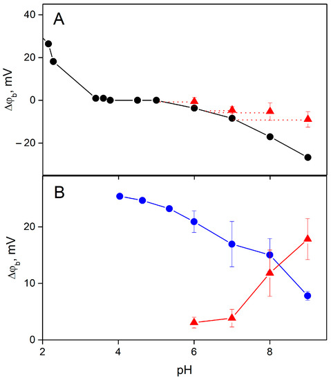 Release of protons from MNPS decreased pH at the membrane surface that resulted in the ∆ϕb increase. The total change in ∆ϕb is a product of boundary potential difference resulting from the MNPS adsorption (Figure 7B, blue symbols) and the coefficient B*, which determines the relative contribution of protons to ∆ϕb (Figure 6). The proton-related part of ∆ϕb is plotted in Figure 7B by red symbols. If we add this value to the equilibrium ∆ϕb (Figure 7A, red symbols) and plot a horizontal line up to the intersection with the pH dependence of equilibrium ∆ϕb (Figure 7A, black curve), we should obtain the correspondence between equilibrium pH at the membrane surface and change in pH resulting from the illumination.