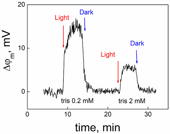 Release of protons from MNPS into the unstirred layer of the solution adjacent to the membrane can be measured by another method, described in [19,20]. We adsorbed MNPS at one side of the BLM, which conducted protons due to the presence of protonophore pentachlorophenol, and measured the open circuit potential with an electrometer. Typical kinetics of the change in OCP under illumination and its following restoration in the dark are presented in Figure 8.