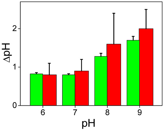 Our results suggest that the main contribution to the change in the ∆ϕb is determined by the change in pH in the unstirred layer adjacent to the membrane. Surface charge of the BLM should influence the distribution of protons between the membrane and water. Recently, the effect of surface charge on the lateral transfer of protons along the membrane and their release in the bulk solution has been found in experiments with fluorescent probes [12]. The dependence of photoinduced ∆ϕb change on pH does not reflect the influence of pH on the rate of the reaction of release of protons from MNPS. To find the actual dependence of the reaction on pH, the absolute value of the pH shift caused by the illumination was determined by subtracting the initial concentration of protons from the total values (Figure 7A). These values are plotted in Figure 11. Absolute shifts in the concentration of protons released from MNPS indicate that the reaction of photo release of protons from MNPS does not depend on pH and is determined only by the pH dependence of the adsorption of MNPS anions at the membrane. Note that the pH dependence of the absolute shift in the concentration of protons released from MNPS (Figure 11) is similar to the pH dependence of the membrane capacitance (Figure 10).