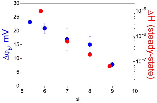 Dependence of the absolute increase in the concentration of protons on pH of the solution (red symbols, right scale). Data were taken from Figure 9. For comparison, the pH dependence of ∆ϕb caused by the adsorption of MNPS at the BLM is plotted (blue symbols, left scale).