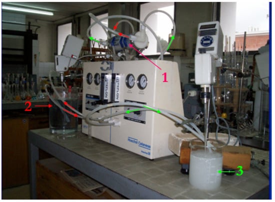 View of the hollow fiber module operating in the recycling mode of the phases. (1) Hollow fiber membrane contactor, (2) feed phase tank, and (3) pseudo-emulsion phase tank. Red colour: feed phase flow. Green colour: pseudo-emulsion phase flow.