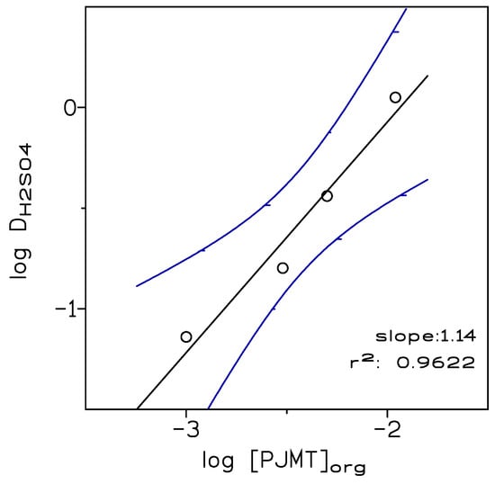 Plot of log DH2SO4 versus log [PJMT]org. The dotted line shows the 95% confidence interval of the regression line. Experimental conditions as in the text and Table 2.