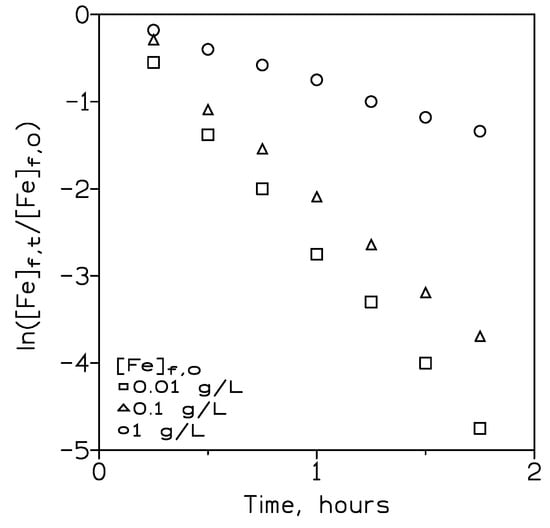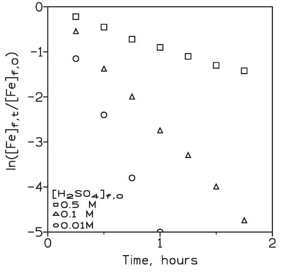 These results were presented in Figure 4, plotting ln ([Fe]f,t/[Fe]f,0) versus time at the various acid concentrations in the feed phase. It was concluded that the variation of the acid concentration in the feed phase had a key influence on the removal of iron(III) from this phase since the permeation coefficient value decreased from 1.8·10−2 cm/min using feed phases containing 10−2 M acid to 3.0·10−3 cm/min when the feed phase contained 0.5 M sulphuric acid.