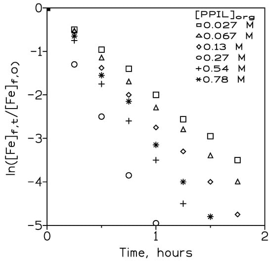 Variation with time of ln([Fe]f,t/[Fe]f,0) at various PPIL concentrations. Feed phase flow: 300 cm3/min. Pseudo-emulsion flow: 100 cm3/min. Temperature: 20 °C.