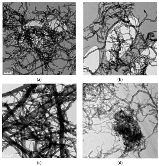 TEM images of chemically modified MWCNTs are shown in Figure 1. Images of pristine MWCNTs were presented in [42] (MWNT-1020 sample) and [43] (MWNT-4060 sample). The difference in the number of layers in CNTs of two samples can be seen. The chemical treatment of MWCNTs induced the shortening of carbon nanotubes, which is a typical effect in chemical treatment of carbon nanomaterials [16]. Additional high-resolution TEM images of treated MWCNTs are presented in Supplementary Materials (Figure S1). The catalytic particles partially remained in both samples within the channel inside the CNTs (Figure S1b in Supplementary Materials). At the same time, there are a lot of empty cups in nanotubes observed in chemically treated materials (probably, the treatment was carried out by manufacturer).