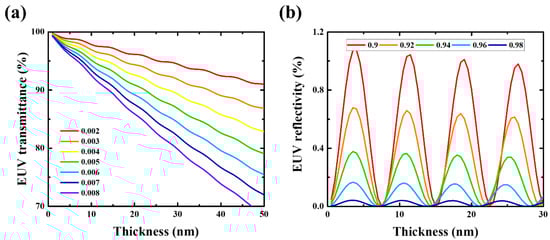 Simulation results of (a) EUV transmittance according to the extinction coefficient and (b) EUV reflectivity according to the refractive index of the membrane at various thicknesses.