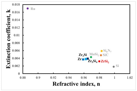 Figure 2 shows the refractive indices and extinction coefficients of various materials at a wavelength of 13.5 nm [16]. Zr and Zr-Si intermetallic compounds exhibited lower extinction coefficients than other EUV pellicle candidates [17]. Among Zr-Si intermetallic compounds, ZrSi2 has the lowest extinction coefficient and the highest refractive index, and, hence, ZrSi2 is expected to exhibit excellent optical properties. The EUV transmittance and reflectivity were simulated as a function of the composition ratio and thickness of the Zr-Si intermetallic compounds, and an optimal composition was determined.