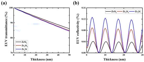 Simulation results of (a) EUV transmittance and (b) EUV reflectivity according to the composition ratio of zirconium silicide (ZrSix).