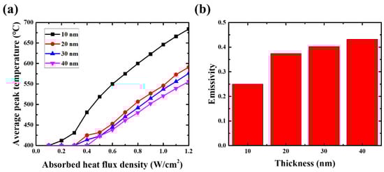 Kirchhoff’s law states that the emissivity of a material is equal to its absorptivity. The EUV pellicle is heated to temperatures in the range of hundreds of degrees Celsius, such that the emitted spectrum is mainly generated in the infrared (IR)-wavelength region during exposure. Therefore, the emissivity of the EUV pellicle can be calculated from the average absorptivity of a thin film in the IR-wavelength region [9,29]. A SiNx thin film with a thickness of several tens of nanometers is transparent in the IR-wavelength region, which implies that its emissivity is close to zero. Therefore, the emissivity of the ZrSi2/SiNx pellicle composite was assumed to be the same as that of the ZrSi2 thin film. Figure 7b shows the emissivity at different thicknesses of the ZrSi2 thin film. The emissivity was calculated from the results of the heat load test using Equation (2). The emissivity increased with an increase in the thickness of the ZrSi2 thin films. The calculated average emissivities of the 10-, 20-, 30-, and 40-nm-thick ZrSi2 thin films were 0.250, 0.374, 0.402, and 0.432, respectively. These values are similar to those of other materials used in EUV pellicle applications. Therefore, ZrSi2 is considered a suitable EUV pellicle material in terms of thermal properties.