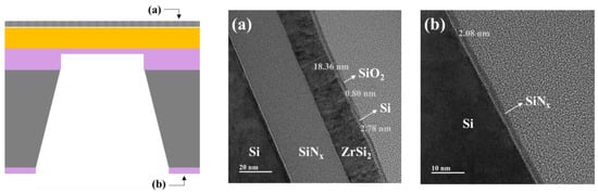 Figure 8 shows the TEM cross-sectional images of the ZrSi2-based pellicle. The structure and layer thickness of the membrane were estimated by analyzing the cross-section of the frame region. Figure 8a shows the top of the frame of the ZrSi2-based pellicle: an 18-nm-thick ZrSi2 layer and a 3-nm-thick Si layer including the surface oxide were observed. In addition, a 2-nm-thick SiNx thin film was observed at the bottom of the frame, as shown in Figure 8b, which was expected to be the same thickness as that of the SiNx layer of the ZrSi2-based pellicle. The measured EUV transmittance and reflectivity of the ZrSi2-based pellicle were 92.7% and 0.033%, respectively, and these values satisfy the EUV pellicle requirements.