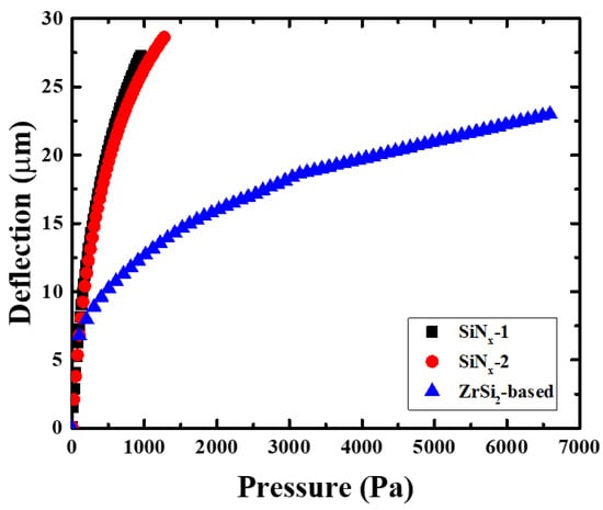 The results of the bulge test of the SiNx membrane and ZrSi2-based pellicle with similar EUV transmittances were compared to evaluate their mechanical durability as shown in Figure 9. The SiNx membrane fractured at a pressure difference of 1116 Pa, whereas the ZrSi2-based pellicle fractured at an approximately 5.9 times higher pressure difference of 6592 Pa. Moreover, the deflection of the ZrSi2-based pellicle was lower than that of the SiNx membrane at the same pressure difference. The strain and stress of the membrane were calculated from the bulge test results using Equations (3) and (4), respectively, and the residual stress and UTS were derived. The residual stress of the ZrSi2-based pellicle was −105 MPa. The UTS of the ZrSi2-based pellicle and SiNx membrane were 3.5 and 0.5 GPa, respectively, and the superior mechanical properties of ZrSi2 were verified.