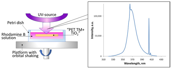 The photocatalytic activity of the systems was studied by the degree of decomposition of the model pollutant Rhodamine B in an aqueous solution (2.5 mg/L). For the photocatalytic tests, 3 g of Rhodamine B solution was inserted into the reactor representing the polypropylene Petri dish (20 mm in diameter) with the experimental sample of “PET TM + TiO2” system. The Petri dish was placed on the platform of IKA Vortex 4 digital with orbital shaking trajectory (IKA-Werke GmbH & Co. KG, Staufen im Breisgau, Germany) at 500 rpm to ensure the uniform mixing of the reaction solution and liquid access to the sample surface. Photocatalysis was provided under UV irradiation within 4 h. Mercury lamp 9 W with λmax 365 nm (Cixi Jindan Electric Appliances Factory, Zhangqi industrial zone, Zhangqi, China) was used as a source and was located above the reactor at a distance of 3 cm (Figure 1). The emission spectrum of used mercury lamp is given on the insert in Figure 1. The second maximum at 404 nm (3.1 eV) has no significant influence on the photocatalytic process because of its low energy. The change in the concentration of the analyte in the solution was determined from the optical absorption spectra in the wavelength range of 400–800 nm. Spectra normalization was realized via the maximum intensity of absorption in the initial solution for all results. To determine the decomposition degree, reference curve in the concentration range from 0 to 10 mg/L was exploited (Figure 2). The curve area 0–2.5 mg/L was rebuilt according to the approximation equation with determined coefficient R2 = 0.9996 and then normalized again to 1 (Figure 2b). To use the calibration curves, each time, the absorption spectrum of the initial solution with the maximum concentration (2.5 mg/L in this case) was recorded, according to which the remaining measurements were normalized. The influence of dye absorption by the membrane on the absorption spectra of solutions was not instrumentally recorded as significant. The maximum registered absorption is about 5% after two hours of dark conditions; thus, we started the main experiment with UV exposure straight (Figure 3). All absorption spectra were registered at room temperature using the spectrophotometer MC 122M UVI-Vis (JSC “SOLAR”, Minsk, Belarus).