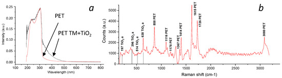 UV-vis spectra of initial PET TM and “PET TM + TiO2” (a) and Raman spectra of “PET TM + TiO2” systems (b).