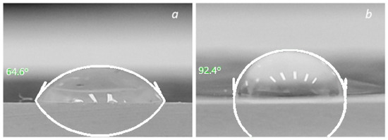 Considering that the main practical applications of breathable films with self-cleaning and antibacterial surfaces are associated with the use of liquid media, the changes in CA before and after the TiO2 functionalization of PET TM were checked. The original PET TM is characterized by a wetting CA of 64.6 ± 2.5 degrees (Figure 5) [31]. The nanostructured titanium dioxide coating modified the surface morphology and increased CA to 92.4 ± 3.2 degrees, which improved the hydrophobic properties of TM. CA more than 90 degrees of the “PET TM + TiO2” systems indicate weak hydrophobic properties.