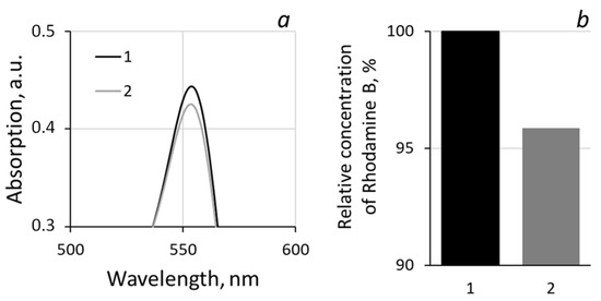 Evolution of the main absorption peak of Rhodamine B (a) before (1) and after (2) dark exposure for two hours (non-normalized spectra) and their percentage (b) with the presence of “PET TM + TiO2” system.