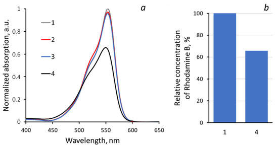 Absorption spectra (a) and relative concentration of Rhodamine B (b) of test solutions: 1—initial, 2—with “PET TM + TiO2” in the dark, 3—with “PET TM + TiO2” under the day light, 4—with “PET TM + TiO2” after UV exposure.
